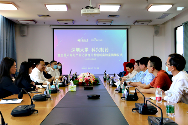 4月29日下午,深圳大學-科興制藥益生菌研究與產業化聯合開發創新實驗室揭牌儀式在深圳大學醫學部會議室順利舉行。深圳大學醫學部主任朱衛國、深圳大學過敏反應和免疫學研究所所長劉志剛、科興制藥總經理趙彥輕、副總經理馬鴻杰等出席了揭牌儀式。