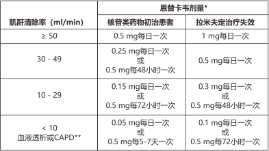 肌酐清除率<50mL/min,包括血液透析或CAPD的患者,建議調(diào)整恩替卡韋的給藥劑量(見【用法用量】)。
