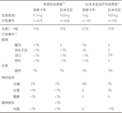 表2比較了在4項臨床研究中恩替卡韋和拉米夫定的不同。其中選擇了中到重度不良事件和治療過程中發(fā)生的至少有可能與治療相關(guān)的臨床不良事件作為比較的指標。