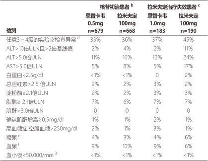 表3四項臨床試驗中使用恩替卡韋和拉米夫定治療后,實驗室檢查異常的發(fā)生頻率。